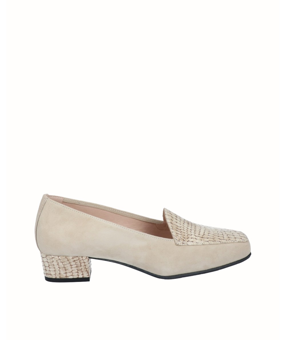 Zapato de tacón bajo de 3 cm, con puntera cuadrada, fabricado en piel ante combinada con piel grabada de la mejor calidad. Su plantilla y su forro de piel facilitan la transpiración de nuestros pies. Comodidad, durabilidad y versatilidad de un calzado 100% español. Cuenta con la garantía de calidad de la marca D´Chicas.